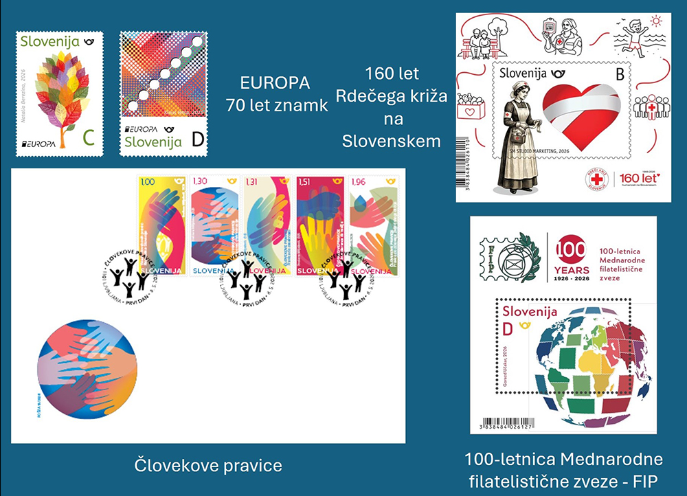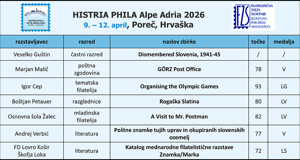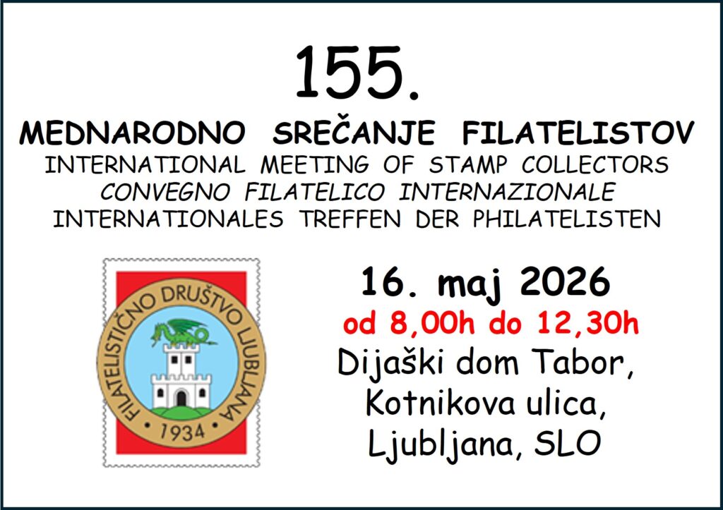 - Po poteh Alme M. Karlin, 3101 Celje, 26. 3. 2026, filatelistična razstava bo v prostorih Strokovno izobraževalnega centra Alme M. Karlin,