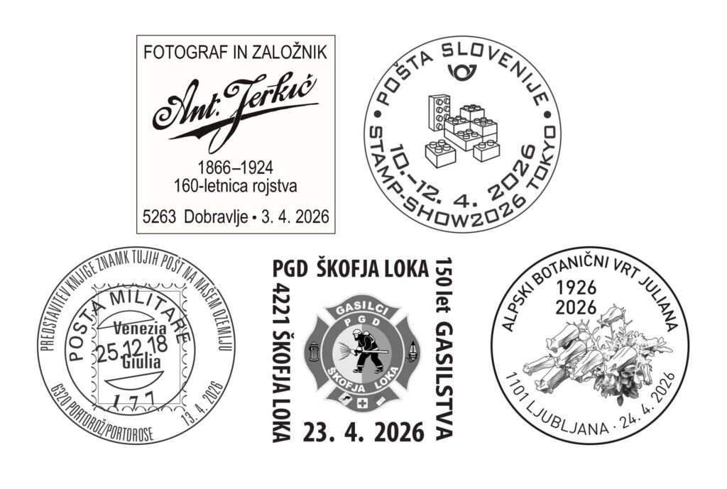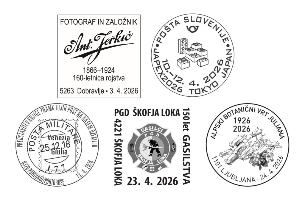 - JAPEX2026, Tokio, Japonska, filatelistična prireditev, 1101 Ljubljana, 10. – 12. april 2026, žig za uslužno žigosanje bo na voljo na pošti 1101 Ljubljana,